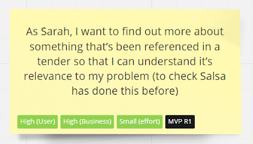 Once again, we used Miro to rank the user stories. It meant we could all collaborate digitally, plus we already had the Miro board setup with the virtual post-it notes for each user story. With this as the base, we set up colour-coding for our ranking system, so each user story could be marked with the relevant labels. In the example below, the story was marked as high desirability for the user, high business value, and small effort to implement. The little black marker shows it was eventually flagged for release in MVP1.